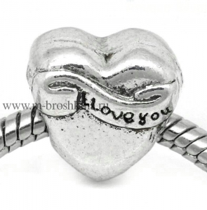 Бусина для Пандоры "Сердце и слова любви" античное серебро, 13х13 мм, 4.8 мм