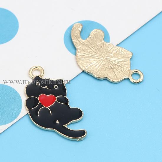 Подвеска золото "Котенок с сердцем", эмаль черная, 30х15 мм